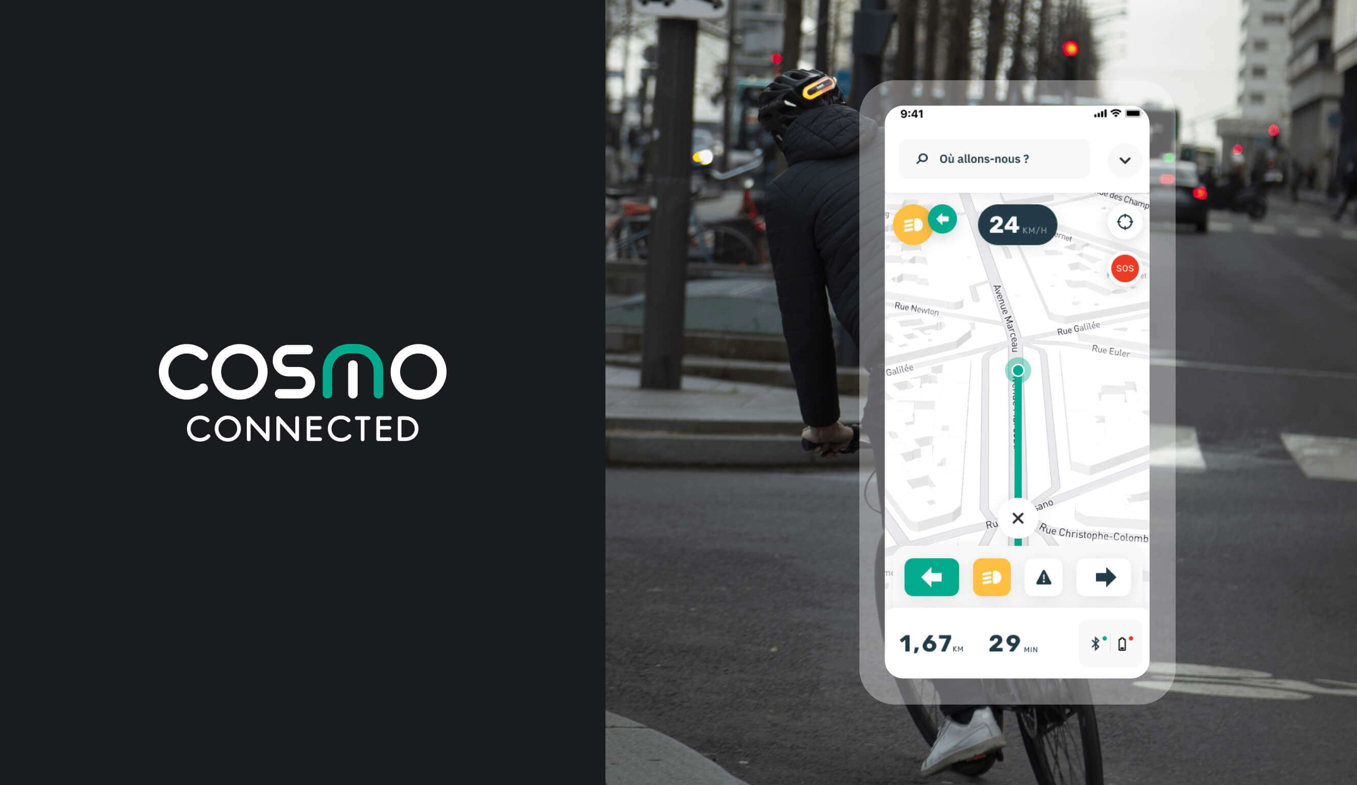 Cosmo Connected propose une assistance à la micro-mobilité pour tous types de trajets quotidiens quel que soit le mode de transport (vélo, trottinette, moto ou scooter). L'application et ses nombreuses fonctionnalités assurent une sécurité accrue tout au long des trajets de leurs usagers, un concept qui révolutionne la micro-mobilité.