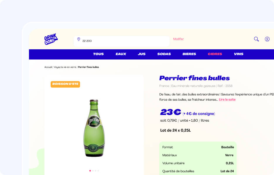 Drink Dong, service de livraison de bouteilles en verre consignées à domicile, nous a sollicités pour concevoir et réaliser son produit digital, de la définition de la stratégie au lancement opérationnel. L’ambition : offrir un accès simple à des boissons locales ou de grandes marques, tout en générant un impact positif sur l’environnement.