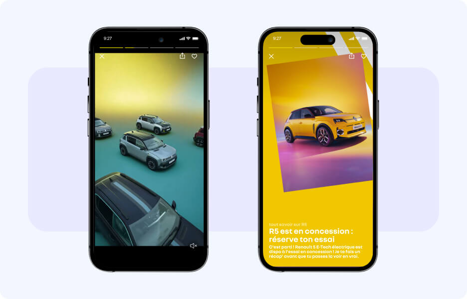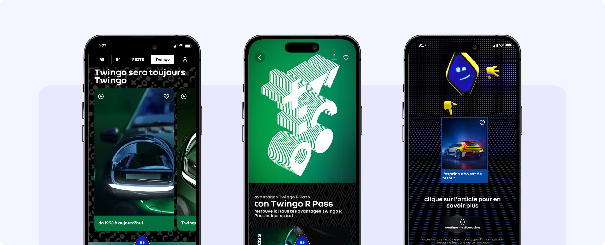 Renault souhaitait proposer une nouvelle expérience mobile immersive à ses clients et prospects. Une application unique permettant : de découvrir les dernières actualités innovantes de Renault, d’échanger avec Reno, l’avatar digital de la marque, de pré-réserver les nouveaux modèles iconiques comme la R5 ou la R4. Objectif : faire de l’app Renault un canal d’engagement et de conversion stratégique, au service de l’innovation et de la relation client.