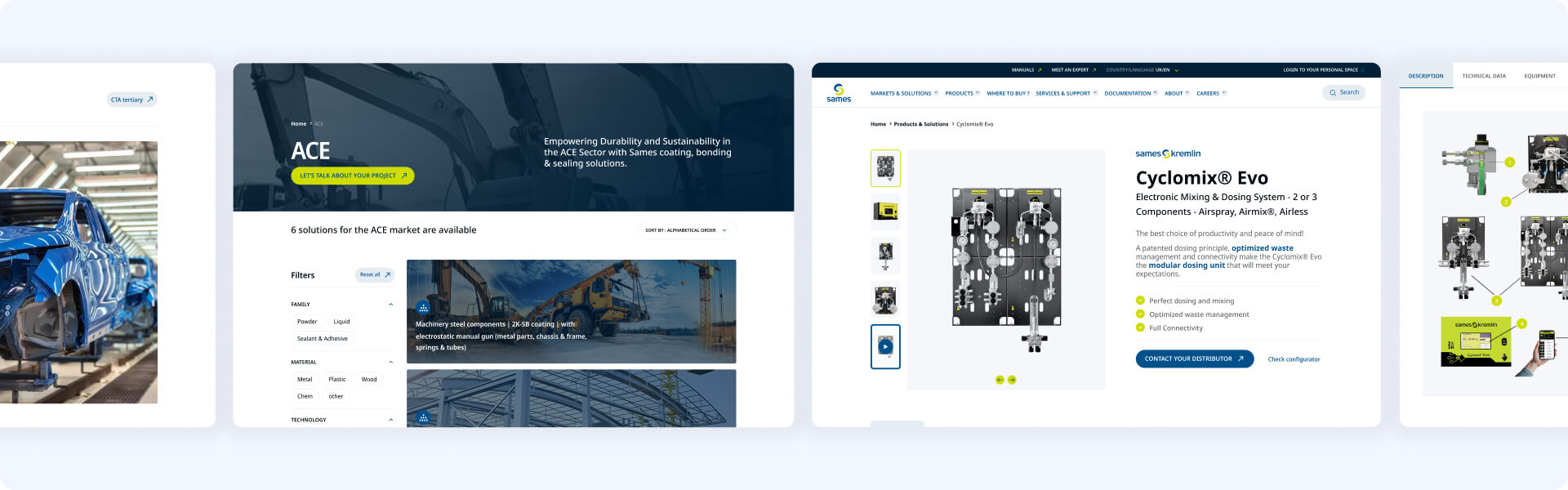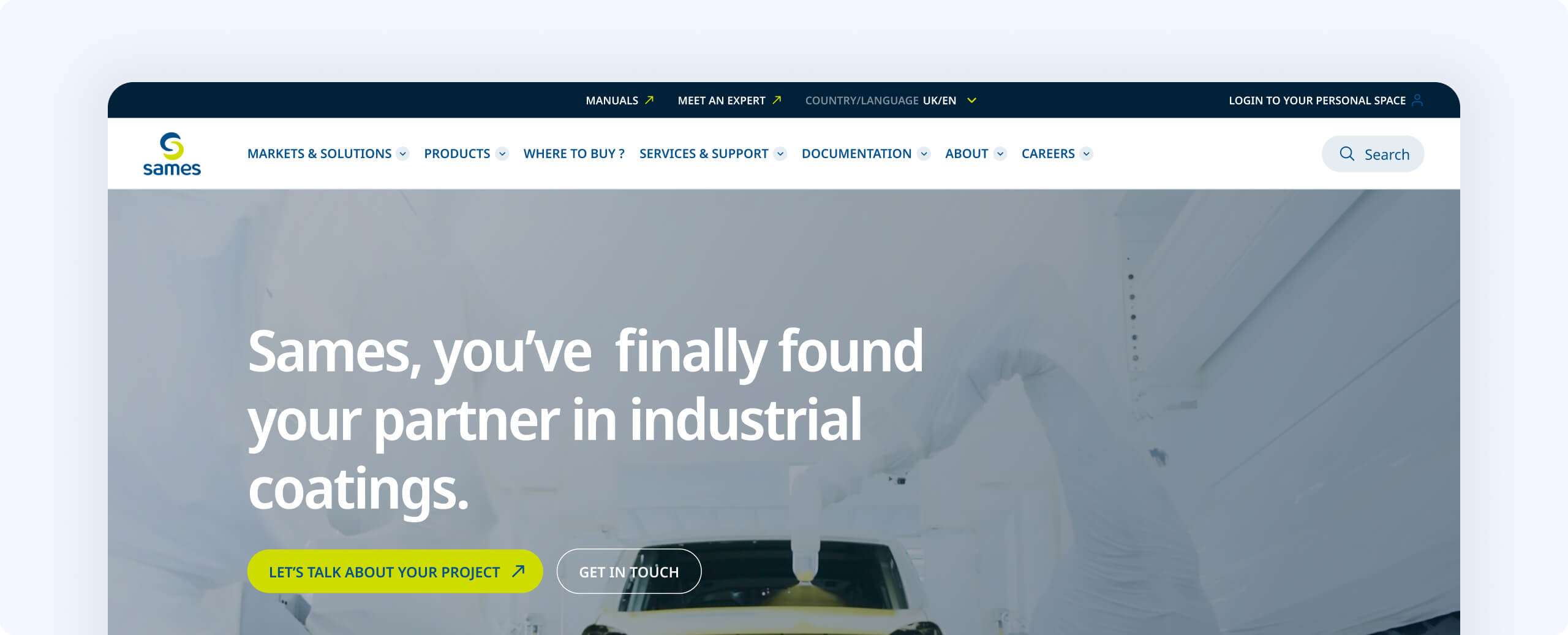 Les équipes Sames nous ont sollicités pour les accompagner dans la refonte complète de leur écosystème digital mondial. Présent à l’international, Sames s’appuie sur un site stratégique, à la fois vitrine de son expertise industrielle, levier marketing et outil au service des équipes internes, partenaires et clients. Avec le temps, la plateforme existante ne répondait plus aux standards UX/UI actuels, ni aux enjeux de performance, d’accessibilité et de pilotage d’un environnement complexe (37 langues, outils métiers, contenus techniques riches). Objectif : repenser l’expérience digitale globale de Sames pour la rendre plus moderne, plus lisible et plus performante, tout en posant des bases solides pour l’avenir.